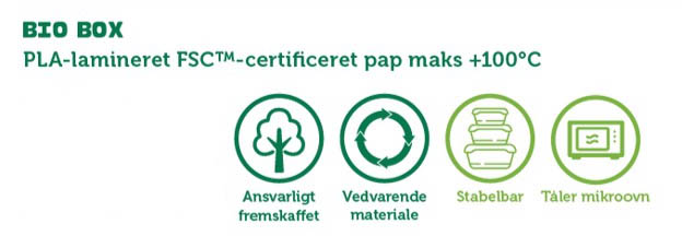 Duni BioPak serie Bio Box er fremstillet FSC™-certificeret pap med en plantebaseret PLA-bioplastbelægning.